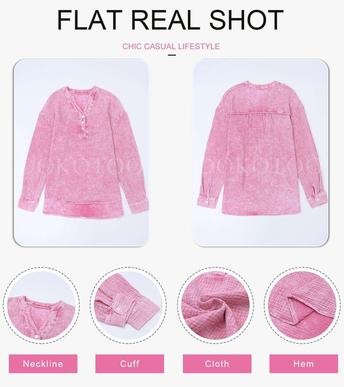 - Feature: V Neck, Solid Color, Front Button Closures, Long Sleeves with Button Cuffs, wear as 3/4 sleeves or full sleeve, Side Slit, Textured Fabrication, Boyfriend Style, Loose Fit Shirts