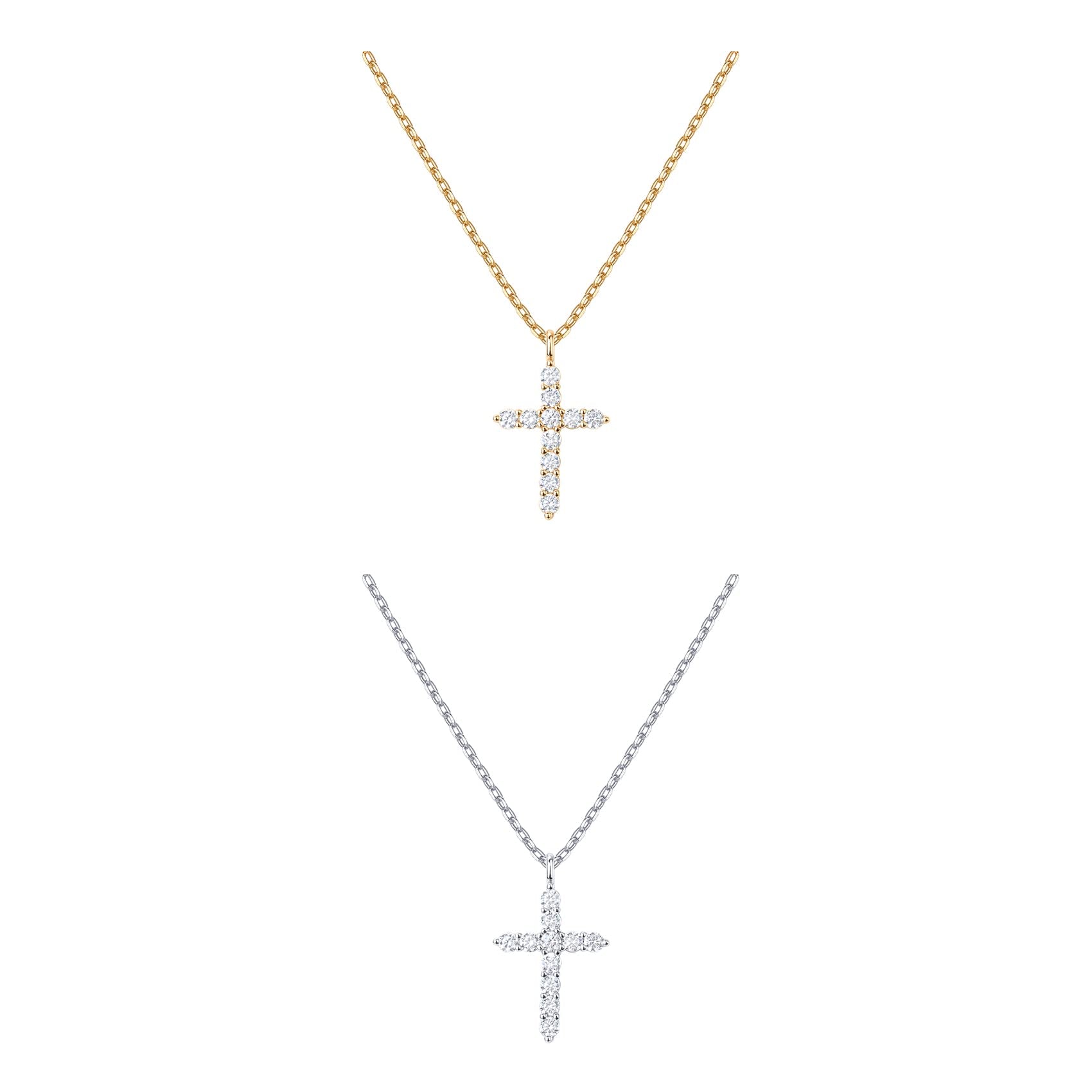 - HIGHLIGHTS: This women's cross-shaped faith necklace is crafted from hand-selected AAAAA-quality cubic zirconia and plated in 14K yellow gold. It features a 19-inch sliding chain that comfortably fits all neck sizes.